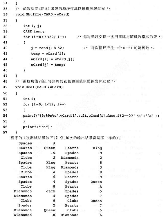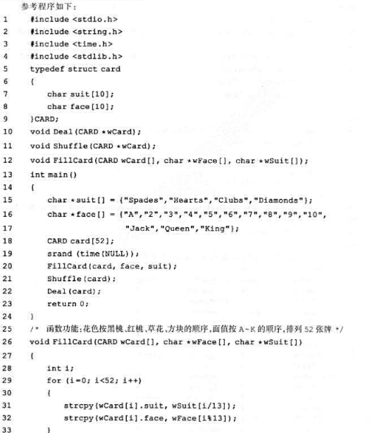 (Spades) 红桃(Hearts) 、草花(Clubs) 、方块(Diamonds) 。每种花色又有13张牌面(Face) :A, 2,3, 4, 5, 6, 7, 8, 9, 10, Jack, Queen, King。要求用结构体数组card表示52张牌, 每张牌包括花色和牌面两个字符型数组类型的数据成员。
