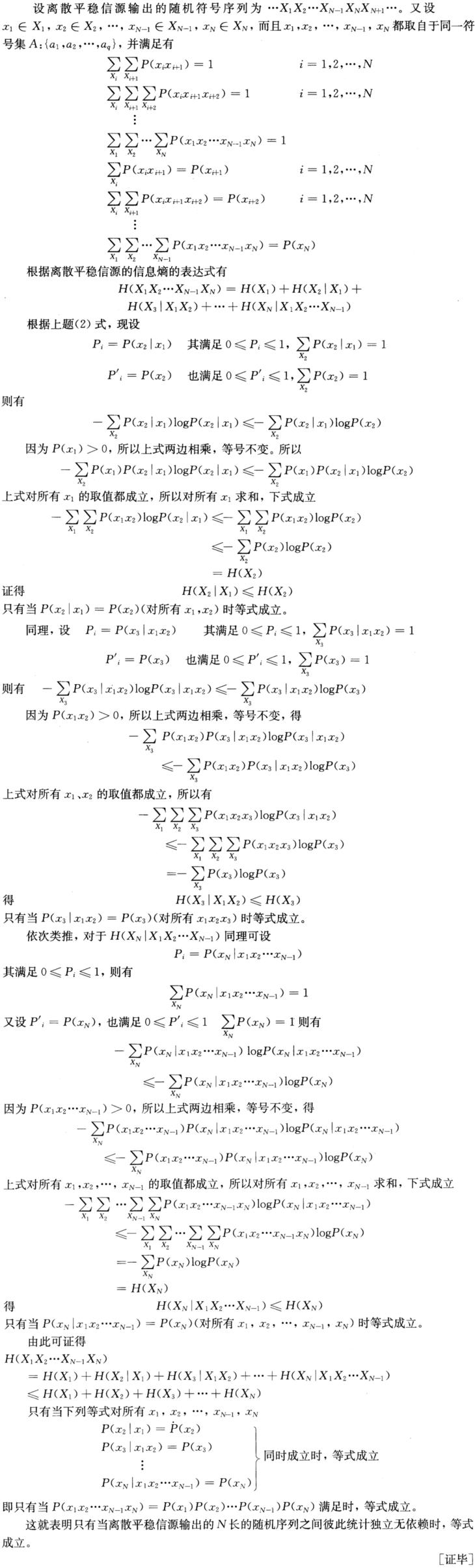 题目:证明离散平稳信源有H(X1X2…XN)≤H(X1)+H(X2)+…+H(XN),并说明等式成立的条件。 证明离散平稳信源有H(X1X2…XN)≤H(X1)+H(X2)+…+H(XN),并说明等式成立的条件。 喵查答案: 喜欢 (1)